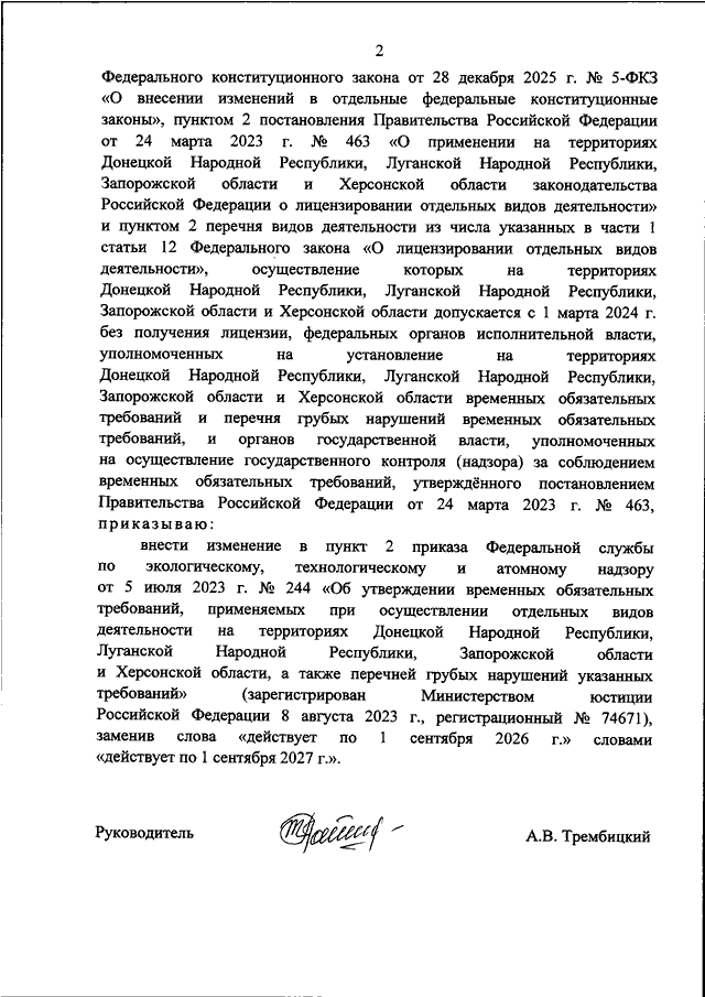 "О ВНЕСЕНИИ ИЗМЕНЕНИЯ В ПРИКАЗ ФЕДЕРАЛЬНОЙ СЛУЖБЫ ПО ЭКОЛОГИЧЕСКОМУ, ТЕХНОЛОГИЧЕСКОМУ И АТОМНОМУ НАДЗОРУ ОТ 5 ИЮЛЯ 2023 Г. N 244 "ОБ УТВЕРЖДЕНИИ ВРЕМЕННЫХ ОБЯЗАТЕЛЬНЫХ ТРЕБОВАНИЙ, ПРИМЕНЯЕМЫХ ПРИ ОСУЩЕСТВЛЕНИИ ОТДЕЛЬНЫХ ВИДОВ ДЕЯТЕЛЬНОСТИ НА ТЕРРИТОРИЯХ ДОНЕЦКОЙ НАРОДНОЙ РЕСПУБЛИКИ, ЛУГАНСКОЙ НАРОДНОЙ РЕСПУБЛИКИ, ЗАПОРОЖСКОЙ ОБЛАСТИ И ХЕРСОНСКОЙ ОБЛАСТИ, А ТАКЖЕ ПЕРЕЧНЕЙ ГРУБЫХ НАРУШЕНИЙ УКАЗАННЫХ ТРЕБОВАНИЙ"