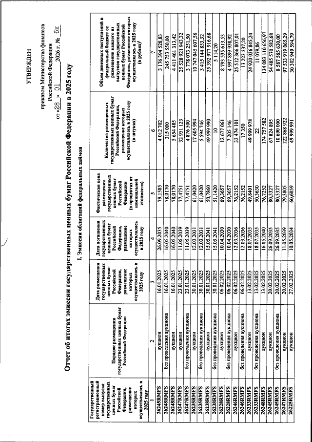 "ОБ УТВЕРЖДЕНИИ ОТЧЕТА ОБ ИТОГАХ ЭМИССИИ ГОСУДАРСТВЕННЫХ ЦЕННЫХ БУМАГ РОССИЙСКОЙ ФЕДЕРАЦИИ В 2025 ГОДУ"