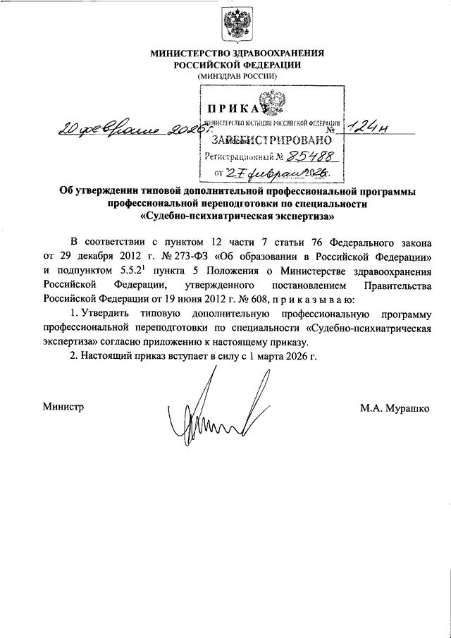 ПРИКАЗ Минздрава РФ от 20.02.2026 N 124н