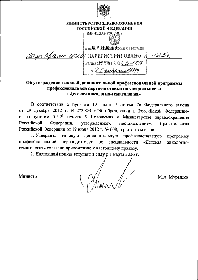 ПРИКАЗ Минздрава РФ от 20.02.2026 N 125н