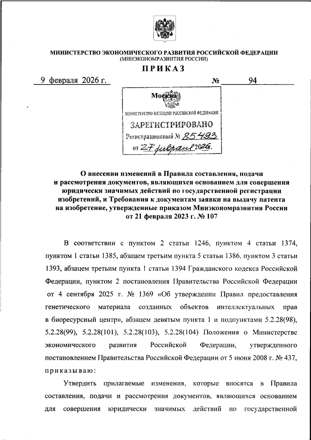 ПРИКАЗ Минэкономразвития РФ от 09.02.2026 N 94