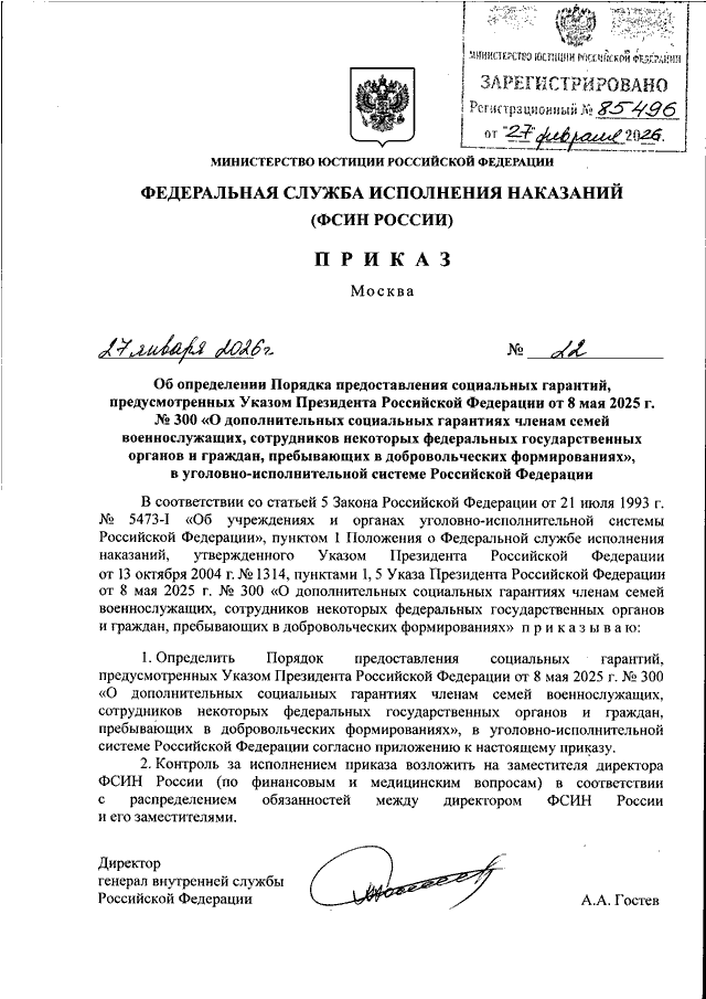 "ОБ ОПРЕДЕЛЕНИИ ПОРЯДКА ПРЕДОСТАВЛЕНИЯ СОЦИАЛЬНЫХ ГАРАНТИЙ, ПРЕДУСМОТРЕННЫХ УКАЗОМ ПРЕЗИДЕНТА РОССИЙСКОЙ ФЕДЕРАЦИИ ОТ 8 МАЯ 2025 Г. N 300 "О ДОПОЛНИТЕЛЬНЫХ СОЦИАЛЬНЫХ ГАРАНТИЯХ ЧЛЕНАМ СЕМЕЙ ВОЕННОСЛУЖАЩИХ, СОТРУДНИКОВ НЕКОТОРЫХ ФЕДЕРАЛЬНЫХ ГОСУДАРСТВЕННЫХ ОРГАНОВ И ГРАЖДАН, ПРЕБЫВАЮЩИХ В ДОБРОВОЛЬЧЕСКИХ ФОРМИРОВАНИЯХ", В УГОЛОВНО - ИСПОЛНИТЕЛЬНОЙ СИСТЕМЕ РОССИЙСКОЙ ФЕДЕРАЦИИ"
