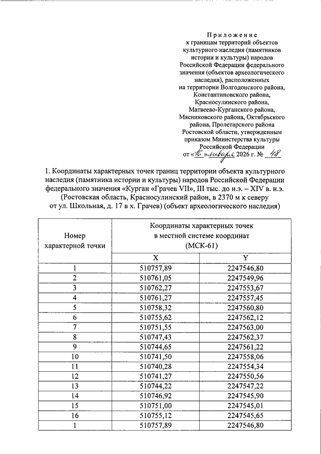 "О ВКЛЮЧЕНИИ ВЫЯВЛЕННЫХ ОБЪЕКТОВ КУЛЬТУРНОГО НАСЛЕДИЯ (ПАМЯТНИКОВ ИСТОРИИ И КУЛЬТУРЫ) НАРОДОВ РОССИЙСКОЙ ФЕДЕРАЦИИ (ОБЪЕКТОВ АРХЕОЛОГИЧЕСКОГО НАСЛЕДИЯ), РАСПОЛОЖЕННЫХ НА ТЕРРИТОРИИ ВОЛГОДОНСКОГО РАЙОНА, КОНСТАНТИНОВСКОГО РАЙОНА, КРАСНОСУЛИНСКОГО РАЙОНА, МАТВЕЕВО - КУРГАНСКОГО РАЙОНА, МЯСНИКОВСКОГО РАЙОНА, ОКТЯБРЬСКОГО РАЙОНА, ПРОЛЕТАРСКОГО РАЙОНА РОСТОВСКОЙ ОБЛАСТИ, В ЕДИНЫЙ ГОСУДАРСТВЕННЫЙ РЕЕСТР ОБЪЕКТОВ КУЛЬТУРНОГО НАСЛЕДИЯ ПАМЯТНИКОВ ИСТОРИИ И КУЛЬТУРЫ) НАРОДОВ РОССИЙСКОЙ ФЕДЕРАЦИИ В КАЧЕСТВЕ ОБЪЕКТОВ КУЛЬТУРНОГО НАСЛЕДИЯ (ПАМЯТНИКОВ ИСТОРИИ И КУЛЬТУРЫ) НАРОДОВ РОССИЙСКОЙ ФЕДЕРАЦИИ ФЕДЕРАЛЬНОГО ЗНАЧЕНИЯ И УТВЕРЖДЕНИИ ГРАНИЦ ИХ ТЕРРИТОРИЙ"