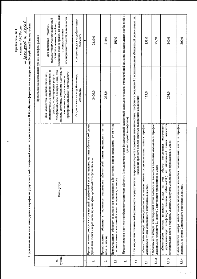 "ОБ УТВЕРЖДЕНИИ ПРЕДЕЛЬНЫХ МАКСИМАЛЬНЫХ УРОВНЕЙ ТАРИФОВ НА УСЛУГИ МЕСТНОЙ ТЕЛЕФОННОЙ СВЯЗИ, УСЛУГУ ПО ПРЕДОСТАВЛЕНИЮ ВНУТРИЗОНОВОГО ТЕЛЕФОННОГО СОЕДИНЕНИЯ АБОНЕНТУ (ПОЛЬЗОВАТЕЛЮ) СЕТИ ФИКСИРОВАННОЙ ТЕЛЕФОННОЙ СВЯЗИ ДЛЯ ПЕРЕДАЧИ ГОЛОСОВОЙ ИНФОРМАЦИИ, ФАКСИМИЛЬНЫХ СООБЩЕНИЙ И ДАННЫХ И ТАРИФОВ НА УСЛУГУ ПО ПЕРЕДАЧЕ ВНУТРЕННЕЙ ТЕЛЕГРАММЫ, ПРЕДОСТАВЛЯЕМЫЕ ПАО "БАШИНФОРМСВЯЗЬ" НА ТЕРРИТОРИИ РЕСПУБЛИКИ БАШКОРТОСТАН"