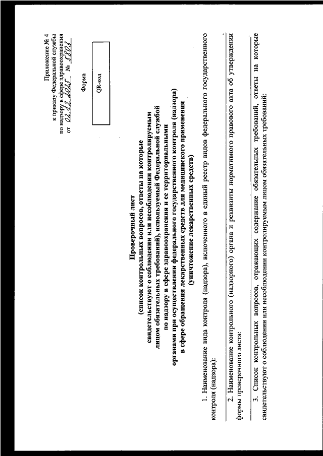 "ОБ УТВЕРЖДЕНИИ ФОРМ ПРОВЕРОЧНЫХ ЛИСТОВ (СПИСКОВ КОНТРОЛЬНЫХ ВОПРОСОВ, ОТВЕТЫ НА КОТОРЫЕ СВИДЕТЕЛЬСТВУЮТ О СОБЛЮДЕНИИ ИЛИ НЕСОБЛЮДЕНИИ КОНТРОЛИРУЕМЫМ ЛИЦОМ ОБЯЗАТЕЛЬНЫХ ТРЕБОВАНИЙ), ИСПОЛЬЗУЕМЫХ ФЕДЕРАЛЬНОЙ СЛУЖБОЙ ПО НАДЗОРУ В СФЕРЕ ЗДРАВООХРАНЕНИЯ И ЕЕ ТЕРРИТОРИАЛЬНЫМИ ОРГАНАМИ ПРИ ОСУЩЕСТВЛЕНИИ ФЕДЕРАЛЬНОГО ГОСУДАРСТВЕННОГО КОНТРОЛЯ (НАДЗОРА) В СФЕРЕ ОБРАЩЕНИЯ ЛЕКАРСТВЕННЫХ СРЕДСТВ ДЛЯ МЕДИЦИНСКОГО ПРИМЕНЕНИЯ"