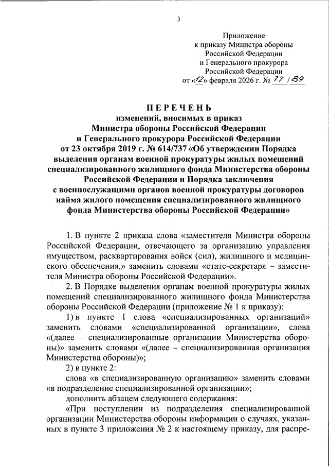 "О ВНЕСЕНИИ ИЗМЕНЕНИЙ В ПРИКАЗ МИНИСТРА ОБОРОНЫ РОССИЙСКОЙ ФЕДЕРАЦИИ И ГЕНЕРАЛЬНОГО ПРОКУРОРА РОССИЙСКОЙ ФЕДЕРАЦИИ ОТ 23 ОКТЯБРЯ 2019 Г. N 614/737 "ОБ УТВЕРЖДЕНИИ ПОРЯДКА ВЫДЕЛЕНИЯ ОРГАНАМ ВОЕННОЙ ПРОКУРАТУРЫ ЖИЛЫХ ПОМЕЩЕНИЙ СПЕЦИАЛИЗИРОВАННОГО ЖИЛИЩНОГО ФОНДА МИНИСТЕРСТВА ОБОРОНЫ РОССИЙСКОЙ ФЕДЕРАЦИИ И ПОРЯДКА ЗАКЛЮЧЕНИЯ С ВОЕННОСЛУЖАЩИМИ ОРГАНОВ ВОЕННОЙ ПРОКУРАТУРЫ ДОГОВОРОВ НАЙМА ЖИЛОГО ПОМЕЩЕНИЯ СПЕЦИАЛИЗИРОВАННОГО ЖИЛИЩНОГО ФОНДА МИНИСТЕРСТВА ОБОРОНЫ РОССИЙСКОЙ ФЕДЕРАЦИИ"