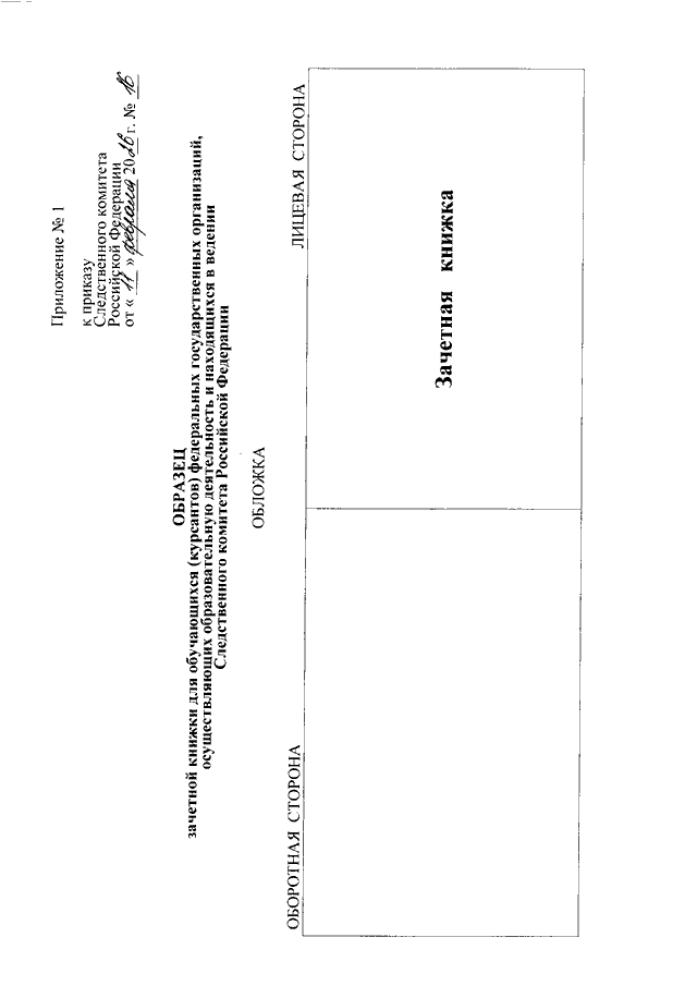 "ОБ УТВЕРЖДЕНИИ ОБРАЗЦОВ ЗАЧЕТНОЙ КНИЖКИ И СТУДЕНЧЕСКОГО БИЛЕТА ДЛЯ ОБУЧАЮЩИХСЯ (КУРСАНТОВ) ФЕДЕРАЛЬНЫХ ГОСУДАРСТВЕННЫХ ОРГАНИЗАЦИЙ, ОСУЩЕСТВЛЯЮЩИХ ОБРАЗОВАТЕЛЬНУЮ ДЕЯТЕЛЬНОСТЬ И НАХОДЯЩИХСЯ В ВЕДЕНИИ СЛЕДСТВЕННОГО КОМИТЕТА РОССИЙСКОЙ ФЕДЕРАЦИИ"