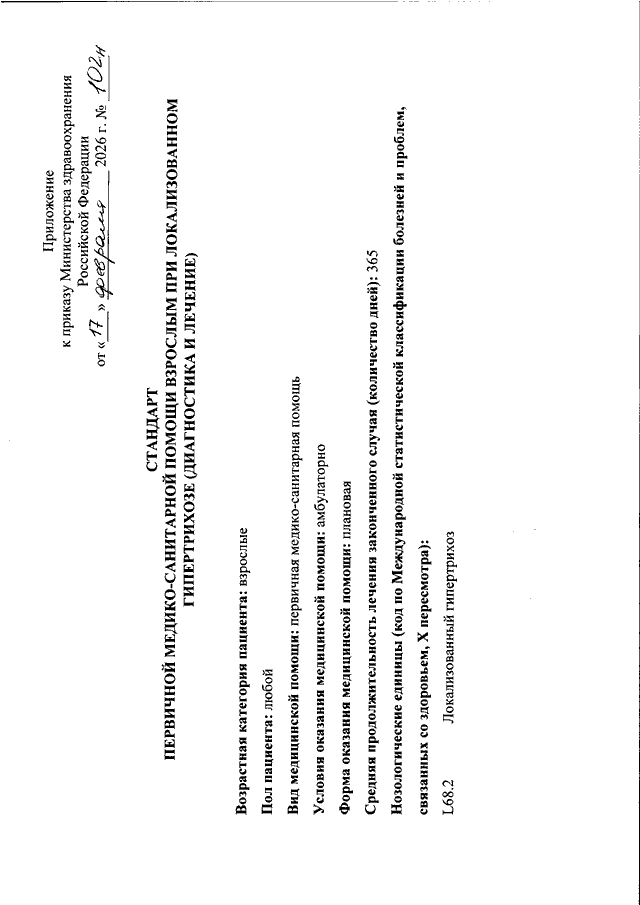 "ОБ УТВЕРЖДЕНИИ СТАНДАРТА ПЕРВИЧНОЙ МЕДИКО - САНИТАРНОЙ ПОМОЩИ ВЗРОСЛЫМ ПРИ ЛОКАЛИЗОВАННОМ ГИПЕРТРИХОЗЕ (ДИАГНОСТИКА И ЛЕЧЕНИЕ)"