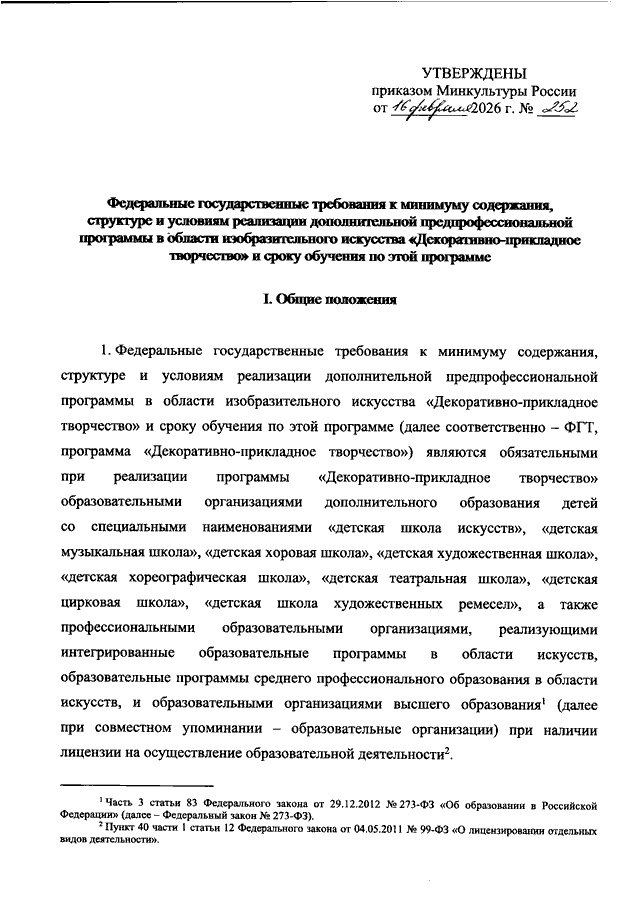 "ОБ УТВЕРЖДЕНИИ ФЕДЕРАЛЬНЫХ ГОСУДАРСТВЕННЫХ ТРЕБОВАНИЙ К СОДЕРЖАНИЮ, СТРУКТУРЕ И УСЛОВИЯМ РЕАЛИЗАЦИИ ДОПОЛНИТЕЛЬНОЙ ПРЕДПРОФЕССИОНАЛЬНОЙ ПРОГРАММЫ В ОБЛАСТИ ИЗОБРАЗИТЕЛЬНОГО ИСКУССТВА "ДЕКОРАТИВНО - ПРИКЛАДНОЕ ТВОРЧЕСТВО" И СРОКУ ОБУЧЕНИЯ ПО ЭТОЙ ПРОГРАММЕ"