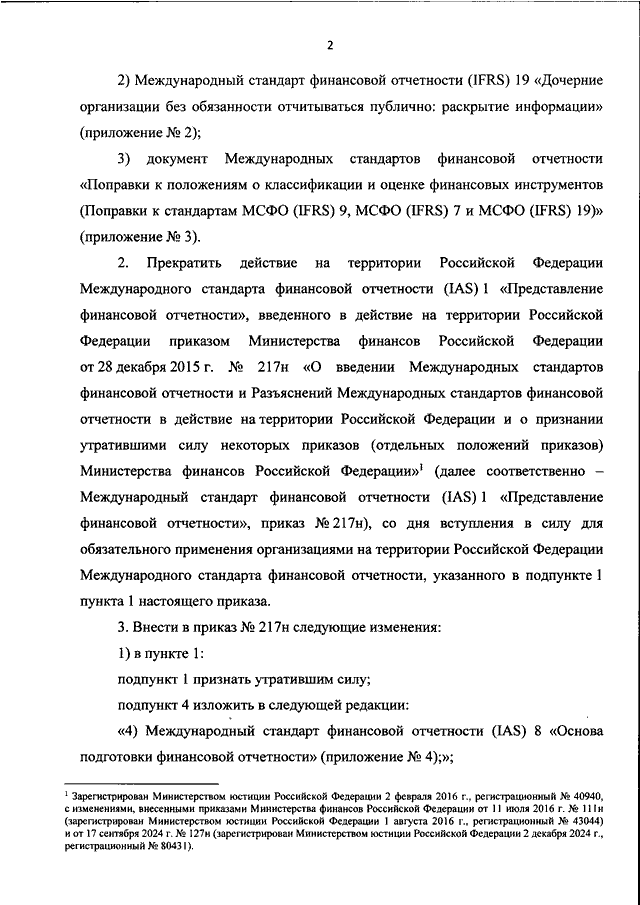 "О ВВЕДЕНИИ В ДЕЙСТВИЕ И ПРЕКРАЩЕНИИ ДЕЙСТВИЯ ДОКУМЕНТОВ МЕЖДУНАРОДНЫХ СТАНДАРТОВ ФИНАНСОВОЙ ОТЧЕТНОСТИ НА ТЕРРИТОРИИ РОССИЙСКОЙ ФЕДЕРАЦИИ И О ВНЕСЕНИИ ИЗМЕНЕНИЙ В ПРИКАЗ МИНИСТЕРСТВА ФИНАНСОВ РОССИЙСКОЙ ФЕДЕРАЦИИ ОТ 28 ДЕКАБРЯ 2015 Г. N 217Н "О ВВЕДЕНИИ МЕЖДУНАРОДНЫХ СТАНДАРТОВ ФИНАНСОВОЙ ОТЧЕТНОСТИ И РАЗЪЯСНЕНИЙ МЕЖДУНАРОДНЫХ СТАНДАРТОВ ФИНАНСОВОЙ ОТЧЕТНОСТИ В ДЕЙСТВИЕ НА ТЕРРИТОРИИ РОССИЙСКОЙ ФЕДЕРАЦИИ И О ПРИЗНАНИИ УТРАТИВШИМИ СИЛУ НЕКОТОРЫХ ПРИКАЗОВ (ОТДЕЛЬНЫХ ПОЛОЖЕНИЙ ПРИКАЗОВ) МИНИСТЕРСТВА ФИНАНСОВ РОССИЙСКОЙ ФЕДЕРАЦИИ"
