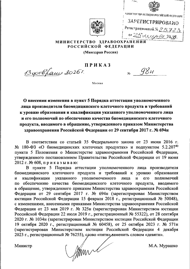 ПРИКАЗ Минздрава РФ от 13.02.2026 N 98н