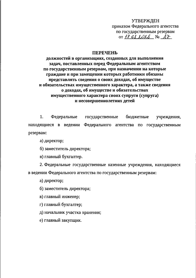 "ОБ УТВЕРЖДЕНИИ ПЕРЕЧНЯ ДОЛЖНОСТЕЙ В ОРГАНИЗАЦИЯХ, СОЗДАННЫХ ДЛЯ ВЫПОЛНЕНИЯ ЗАДАЧ, ПОСТАВЛЕННЫХ ПЕРЕД ФЕДЕРАЛЬНЫМ АГЕНТСТВОМ ПО ГОСУДАРСТВЕННЫМ РЕЗЕРВАМ, ПРИ НАЗНАЧЕНИИ НА КОТОРЫЕ ГРАЖДАНЕ И ПРИ ЗАМЕЩЕНИИ КОТОРЫХ РАБОТНИКИ ОБЯЗАНЫ ПРЕДСТАВЛЯТЬ СВЕДЕНИЯ О СВОИХ ДОХОДАХ, ОБ ИМУЩЕСТВЕ И ОБЯЗАТЕЛЬСТВАХ ИМУЩЕСТВЕННОГО ХАРАКТЕРА, А ТАКЖЕ СВЕДЕНИЯ О ДОХОДАХ, ОБ ИМУЩЕСТВЕ И ОБЯЗАТЕЛЬСТВАХ ИМУЩЕСТВЕННОГО ХАРАКТЕРА СВОИХ СУПРУГИ (СУПРУГА) И НЕСОВЕРШЕННОЛЕТНИХ ДЕТЕЙ"