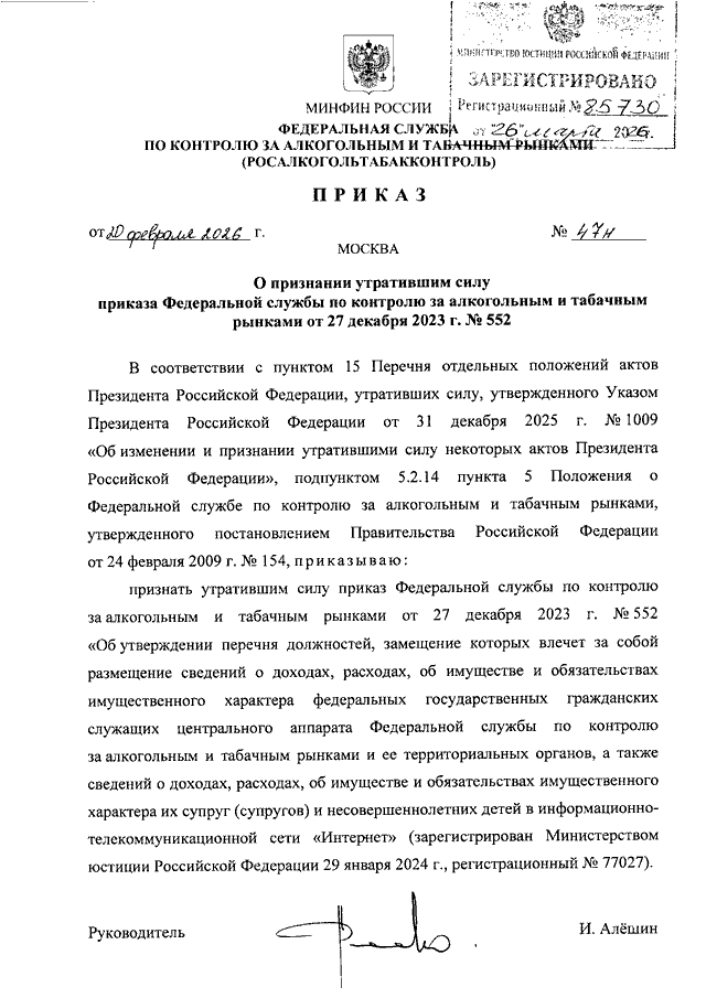 "О ПРИЗНАНИИ УТРАТИВШИМ СИЛУ ПРИКАЗА ФЕДЕРАЛЬНОЙ СЛУЖБЫ ПО КОНТРОЛЮ ЗА АЛКОГОЛЬНЫМ И ТАБАЧНЫМ РЫНКАМИ ОТ 27 ДЕКАБРЯ 2023 Г. N 552"