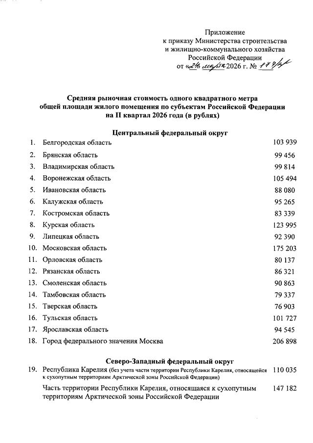 "О СРЕДНЕЙ РЫНОЧНОЙ СТОИМОСТИ ОДНОГО КВАДРАТНОГО МЕТРА ОБЩЕЙ ПЛОЩАДИ ЖИЛОГО ПОМЕЩЕНИЯ ПО СУБЪЕКТАМ РОССИЙСКОЙ ФЕДЕРАЦИИ НА II КВАРТАЛ 2026 ГОДА"
