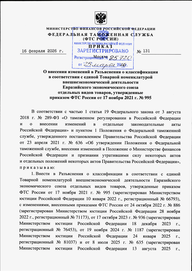 ПРИКАЗ ФТС РФ от 16.02.2026 N 131