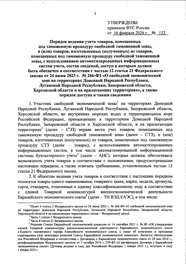 ПРИКАЗ ФТС РФ от 16.02.2026 N 132