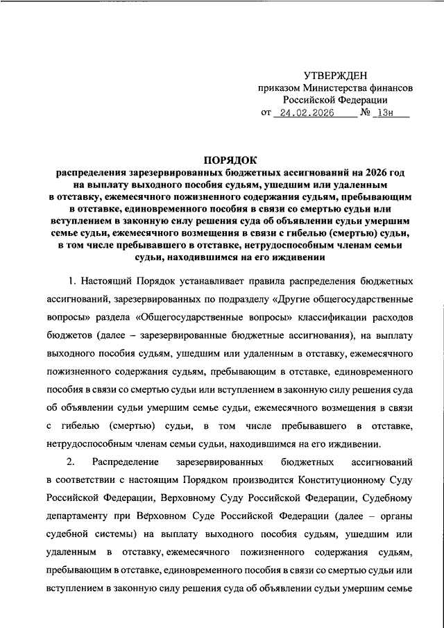 "ОБ УТВЕРЖДЕНИИ ПОРЯДКА РАСПРЕДЕЛЕНИЯ ЗАРЕЗЕРВИРОВАННЫХ БЮДЖЕТНЫХ АССИГНОВАНИЙ НА 2026 ГОД НА ВЫПЛАТУ ВЫХОДНОГО ПОСОБИЯ СУДЬЯМ, УШЕДШИМ ИЛИ УДАЛЕННЫМ В ОТСТАВКУ, ЕЖЕМЕСЯЧНОГО ПОЖИЗНЕННОГО СОДЕРЖАНИЯ СУДЬЯМ, ПРЕБЫВАЮЩИМ В ОТСТАВКЕ, ЕДИНОВРЕМЕННОГО ПОСОБИЯ В СВЯЗИ СО СМЕРТЬЮ СУДЬИ ИЛИ ВСТУПЛЕНИЕМ В ЗАКОННУЮ СИЛУ РЕШЕНИЯ СУДА ОБ ОБЪЯВЛЕНИИ СУДЬИ УМЕРШИМ СЕМЬЕ СУДЬИ, ЕЖЕМЕСЯЧНОГО ВОЗМЕЩЕНИЯ В СВЯЗИ С ГИБЕЛЬЮ (СМЕРТЬЮ) СУДЬИ, В ТОМ ЧИСЛЕ ПРЕБЫВАВШЕГО В ОТСТАВКЕ, НЕТРУДОСПОСОБНЫМ ЧЛЕНАМ СЕМЬИ СУДЬИ, НАХОДИВШИМСЯ НА ЕГО ИЖДИВЕНИИ"