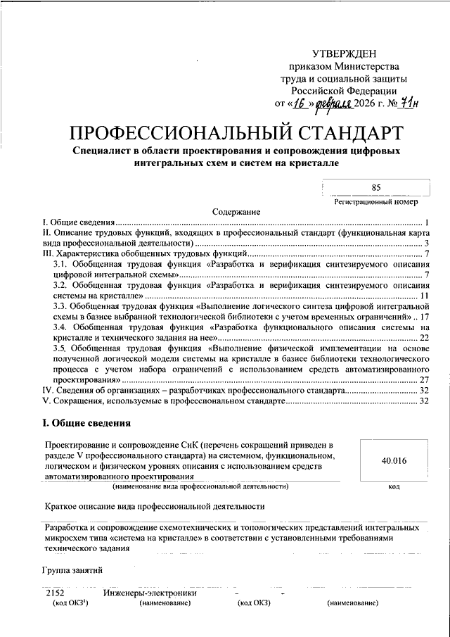 "ОБ УТВЕРЖДЕНИИ ПРОФЕССИОНАЛЬНОГО СТАНДАРТА "СПЕЦИАЛИСТ В ОБЛАСТИ ПРОЕКТИРОВАНИЯ И СОПРОВОЖДЕНИЯ ЦИФРОВЫХ ИНТЕГРАЛЬНЫХ СХЕМ И СИСТЕМ НА КРИСТАЛЛЕ"