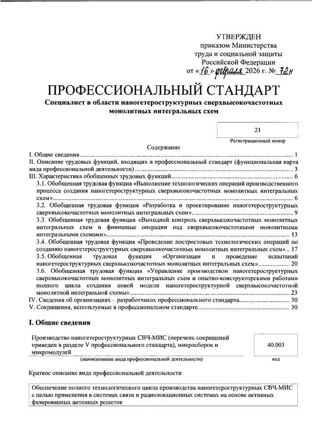"ОБ УТВЕРЖДЕНИИ ПРОФЕССИОНАЛЬНОГО СТАНДАРТА "СПЕЦИАЛИСТ В ОБЛАСТИ НАНОГЕТЕРОСТРУКТУРНЫХ СВЕРХВЫСОКОЧАСТОТНЫХ МОНОЛИТНЫХ ИНТЕГРАЛЬНЫХ СХЕМ"