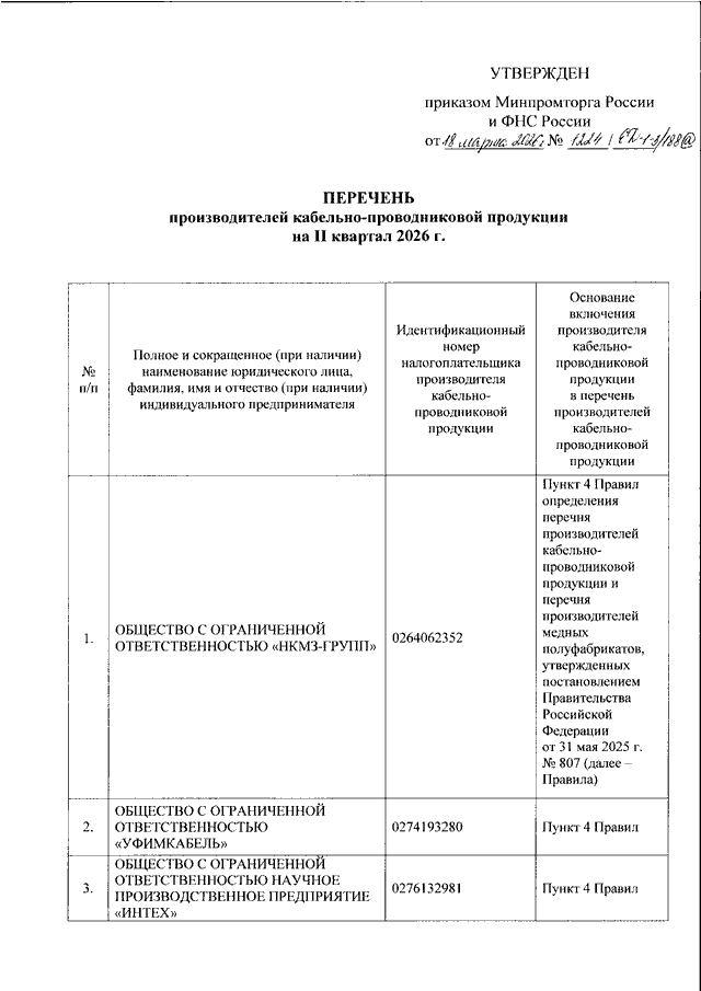 "ОБ УТВЕРЖДЕНИИ ПЕРЕЧНЯ ПРОИЗВОДИТЕЛЕЙ КАБЕЛЬНО - ПРОВОДНИКОВОЙ ПРОДУКЦИИ НА II КВАРТАЛ 2026 Г."