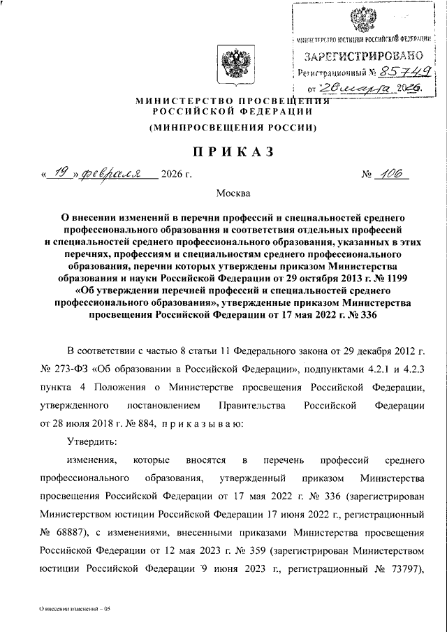 ПРИКАЗ Минпросвещения России от 19.02.2026 N 106
