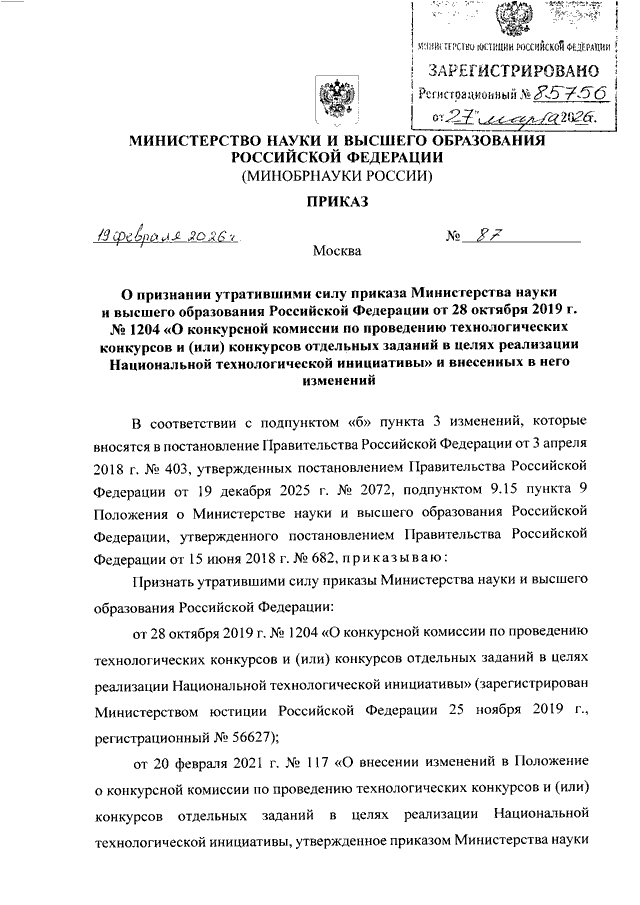 ПРИКАЗ Минобрнауки РФ от 19.02.2026 N 87