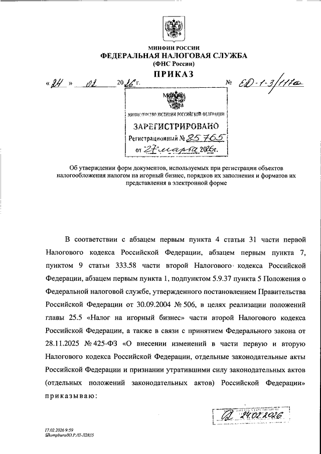 ПРИКАЗ ФНС РФ от 24.02.2026 N ЕД-1-3/117@