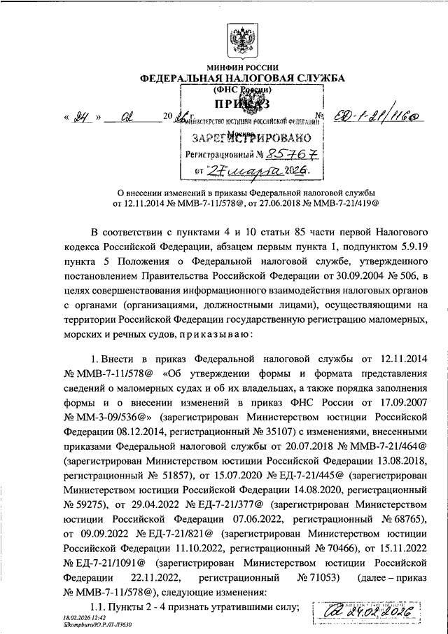 ПРИКАЗ ФНС РФ от 24.02.2026 N ЕД-1-21/116@
