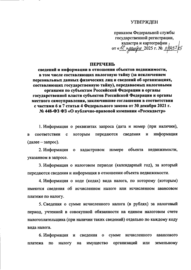 "ОБ УТВЕРЖДЕНИИ ПЕРЕЧНЯ СВЕДЕНИЙ И ИНФОРМАЦИИ В ОТНОШЕНИИ ОБЪЕКТОВ НЕДВИЖИМОСТИ, В ТОМ ЧИСЛЕ СОСТАВЛЯЮЩИХ НАЛОГОВУЮ ТАЙНУ (ЗА ИСКЛЮЧЕНИЕМ ПЕРСОНАЛЬНЫХ ДАННЫХ ФИЗИЧЕСКИХ ЛИЦ И СВЕДЕНИЙ ОБ ОРГАНИЗАЦИЯХ, СОСТАВЛЯЮЩИХ ГОСУДАРСТВЕННУЮ ТАЙНУ), ПЕРЕДАВАЕМЫХ НАЛОГОВЫМИ ОРГАНАМИ ПО СУБЪЕКТАМ РОССИЙСКОЙ ФЕДЕРАЦИИ В ОРГАНЫ ГОСУДАРСТВЕННОЙ ВЛАСТИ СУБЪЕКТОВ РОССИЙСКОЙ ФЕДЕРАЦИИ И ОРГАНЫ МЕСТНОГО САМОУПРАВЛЕНИЯ, ЗАКЛЮЧИВШИЕ СОГЛАШЕНИЯ В СООТВЕТСТВИИ С ЧАСТЯМИ 6 И 7 СТАТЬИ 4 ФЕДЕРАЛЬНОГО ЗАКОНА ОТ 30 ДЕКАБРЯ 2021 Г. N 448-ФЗ "О ПУБЛИЧНО - ПРАВОВОЙ КОМПАНИИ "РОСКАДАСТР"