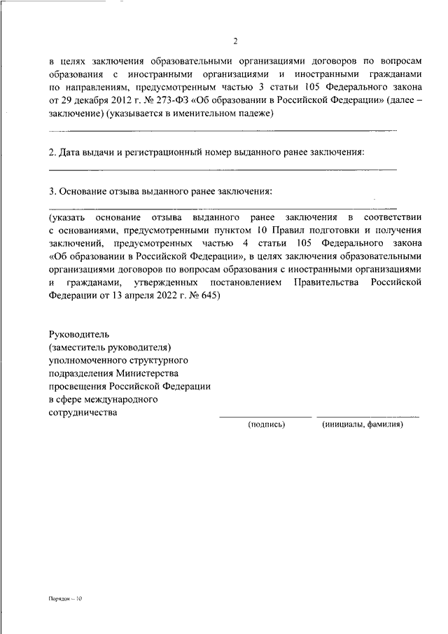 "ОБ УТВЕРЖДЕНИИ ПОРЯДКА ОТЗЫВА МИНИСТЕРСТВОМ ПРОСВЕЩЕНИЯ РОССИЙСКОЙ ФЕДЕРАЦИИ ВЫДАННОГО РАНЕЕ ЗАКЛЮЧЕНИЯ, ПРЕДУСМОТРЕННОГО ЧАСТЬЮ 4 СТАТЬИ 105 ФЕДЕРАЛЬНОГО ЗАКОНА ОТ 29 ДЕКАБРЯ 2012 Г. N 273-ФЗ "ОБ ОБРАЗОВАНИИ В РОССИЙСКОЙ ФЕДЕРАЦИИ", В ЦЕЛЯХ ЗАКЛЮЧЕНИЯ ОБРАЗОВАТЕЛЬНЫМИ ОРГАНИЗАЦИЯМИ ДОГОВОРОВ ПО ВОПРОСАМ ОБРАЗОВАНИЯ С ИНОСТРАННЫМИ ОРГАНИЗАЦИЯМИ И ИНОСТРАННЫМИ ГРАЖДАНАМИ ПО НАПРАВЛЕНИЯМ, ПРЕДУСМОТРЕННЫМ ЧАСТЬЮ 3 СТАТЬИ 105 ФЕДЕРАЛЬНОГО ЗАКОНА ОТ 29 ДЕКАБРЯ 2012 Г. N 273-ФЗ "ОБ ОБРАЗОВАНИИ В РОССИЙСКОЙ ФЕДЕРАЦИИ"