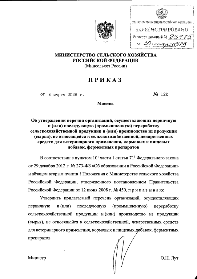ПРИКАЗ Минсельхоза РФ от 04.03.2026 N 122