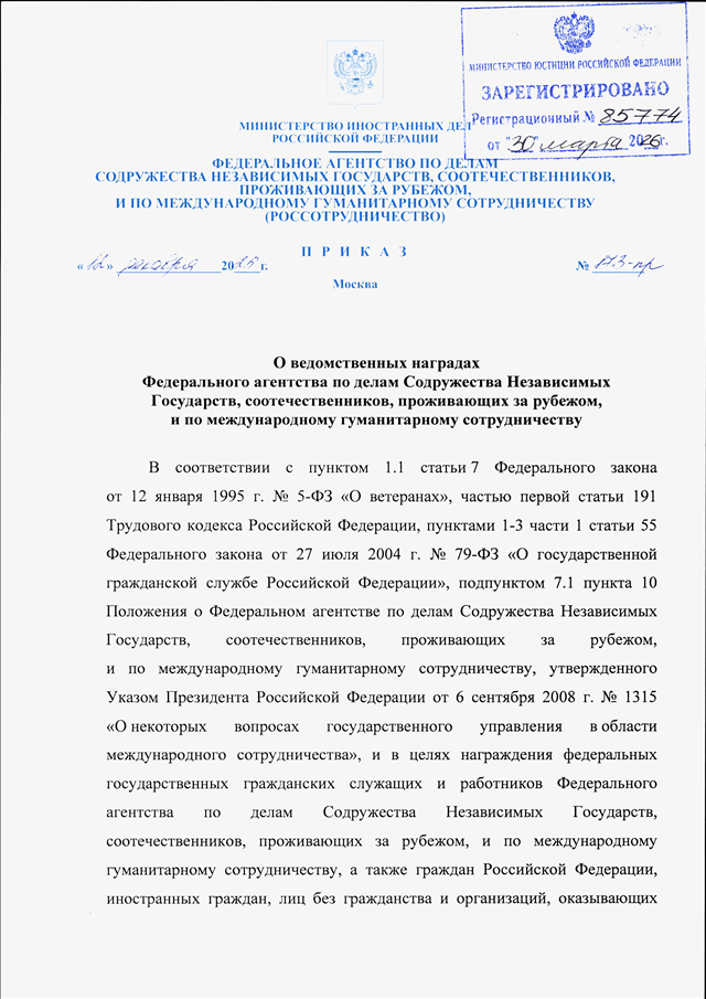 "О ВЕДОМСТВЕННЫХ НАГРАДАХ ФЕДЕРАЛЬНОГО АГЕНТСТВА ПО ДЕЛАМ СОДРУЖЕСТВА НЕЗАВИСИМЫХ ГОСУДАРСТВ, СООТЕЧЕСТВЕННИКОВ, ПРОЖИВАЮЩИХ ЗА РУБЕЖОМ, И ПО МЕЖДУНАРОДНОМУ ГУМАНИТАРНОМУ СОТРУДНИЧЕСТВУ"