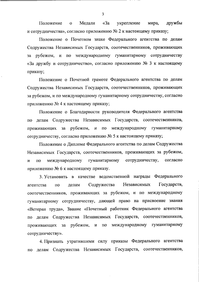 "О ВЕДОМСТВЕННЫХ НАГРАДАХ ФЕДЕРАЛЬНОГО АГЕНТСТВА ПО ДЕЛАМ СОДРУЖЕСТВА НЕЗАВИСИМЫХ ГОСУДАРСТВ, СООТЕЧЕСТВЕННИКОВ, ПРОЖИВАЮЩИХ ЗА РУБЕЖОМ, И ПО МЕЖДУНАРОДНОМУ ГУМАНИТАРНОМУ СОТРУДНИЧЕСТВУ"