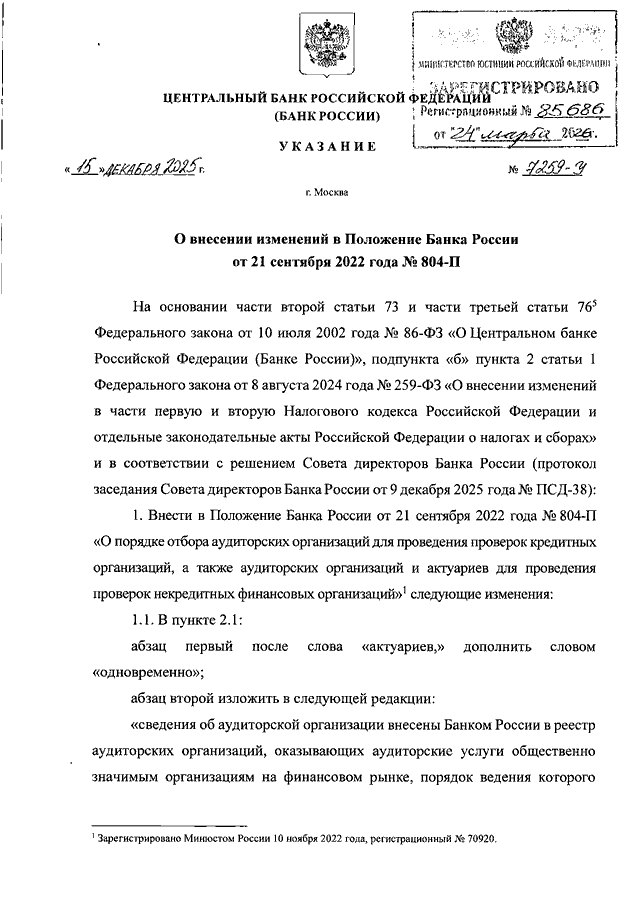 УКАЗАНИЕ ЦБ РФ от 15.12.2025 N 7259-У