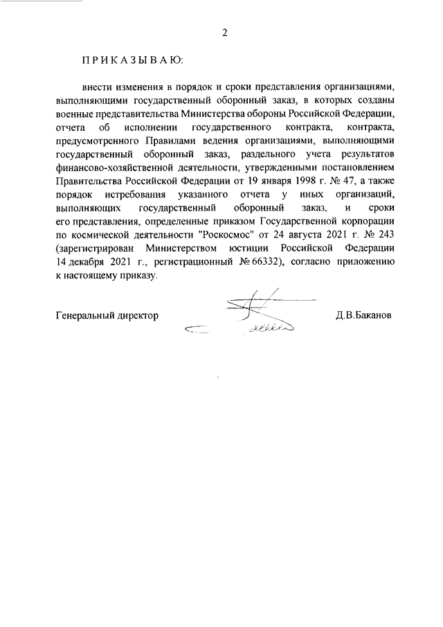 "Роскосмос" от 29.01.2026 N 11 "О ВНЕСЕНИИ ИЗМЕНЕНИЙ В ПОРЯДОК И СРОКИ ПРЕДСТАВЛЕНИЯ ОРГАНИЗАЦИЯМИ, ВЫПОЛНЯЮЩИМИ ГОСУДАРСТВЕННЫЙ ОБОРОННЫЙ ЗАКАЗ, В КОТОРЫХ СОЗДАНЫ ВОЕННЫЕ ПРЕДСТАВИТЕЛЬСТВА МИНИСТЕРСТВА ОБОРОНЫ РОССИЙСКОЙ ФЕДЕРАЦИИ, ОТЧЕТА ОБ ИСПОЛНЕНИИ ГОСУДАРСТВЕННОГО КОНТРАКТА, КОНТРАКТА, ПРЕДУСМОТРЕННОГО ПРАВИЛАМИ ВЕДЕНИЯ ОРГАНИЗАЦИЯМИ, ВЫПОЛНЯЮЩИМИ ГОСУДАРСТВЕННЫЙ ОБОРОННЫЙ ЗАКАЗ, РАЗДЕЛЬНОГО УЧЕТА РЕЗУЛЬТАТОВ ФИНАНСОВО - ХОЗЯЙСТВЕННОЙ ДЕЯТЕЛЬНОСТИ, УТВЕРЖДЕННЫМИ ПОСТАНОВЛЕНИЕМ ПРАВИТЕЛЬСТВА РОССИЙСКОЙ ФЕДЕРАЦИИ ОТ 19 ЯНВАРЯ 1998 Г. N 47, А ТАКЖЕ ПОРЯДОК ИСТРЕБОВАНИЯ УКАЗАННОГО ОТЧЕТА У ИНЫХ ОРГАНИЗАЦИЙ, ВЫПОЛНЯЮЩИХ ГОСУДАРСТВЕННЫЙ ОБОРОННЫЙ ЗАКАЗ, И СРОКИ ЕГО ПРЕДСТАВЛЕНИЯ, ОПРЕДЕЛЕННЫЕ ПРИКАЗОМ ГОСУДАРСТВЕННОЙ КОРПОРАЦИИ ПО КОСМИЧЕСКОЙ ДЕЯТЕЛЬНОСТИ "РОСКОСМОС" ОТ 24 АВГУСТА 2021 Г. N 243"