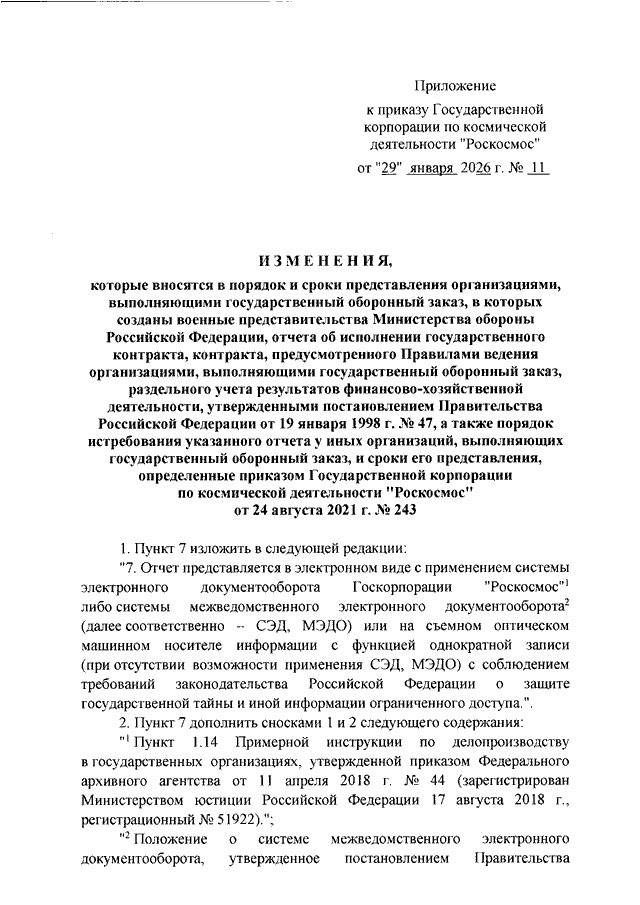"Роскосмос" от 29.01.2026 N 11 "О ВНЕСЕНИИ ИЗМЕНЕНИЙ В ПОРЯДОК И СРОКИ ПРЕДСТАВЛЕНИЯ ОРГАНИЗАЦИЯМИ, ВЫПОЛНЯЮЩИМИ ГОСУДАРСТВЕННЫЙ ОБОРОННЫЙ ЗАКАЗ, В КОТОРЫХ СОЗДАНЫ ВОЕННЫЕ ПРЕДСТАВИТЕЛЬСТВА МИНИСТЕРСТВА ОБОРОНЫ РОССИЙСКОЙ ФЕДЕРАЦИИ, ОТЧЕТА ОБ ИСПОЛНЕНИИ ГОСУДАРСТВЕННОГО КОНТРАКТА, КОНТРАКТА, ПРЕДУСМОТРЕННОГО ПРАВИЛАМИ ВЕДЕНИЯ ОРГАНИЗАЦИЯМИ, ВЫПОЛНЯЮЩИМИ ГОСУДАРСТВЕННЫЙ ОБОРОННЫЙ ЗАКАЗ, РАЗДЕЛЬНОГО УЧЕТА РЕЗУЛЬТАТОВ ФИНАНСОВО - ХОЗЯЙСТВЕННОЙ ДЕЯТЕЛЬНОСТИ, УТВЕРЖДЕННЫМИ ПОСТАНОВЛЕНИЕМ ПРАВИТЕЛЬСТВА РОССИЙСКОЙ ФЕДЕРАЦИИ ОТ 19 ЯНВАРЯ 1998 Г. N 47, А ТАКЖЕ ПОРЯДОК ИСТРЕБОВАНИЯ УКАЗАННОГО ОТЧЕТА У ИНЫХ ОРГАНИЗАЦИЙ, ВЫПОЛНЯЮЩИХ ГОСУДАРСТВЕННЫЙ ОБОРОННЫЙ ЗАКАЗ, И СРОКИ ЕГО ПРЕДСТАВЛЕНИЯ, ОПРЕДЕЛЕННЫЕ ПРИКАЗОМ ГОСУДАРСТВЕННОЙ КОРПОРАЦИИ ПО КОСМИЧЕСКОЙ ДЕЯТЕЛЬНОСТИ "РОСКОСМОС" ОТ 24 АВГУСТА 2021 Г. N 243"