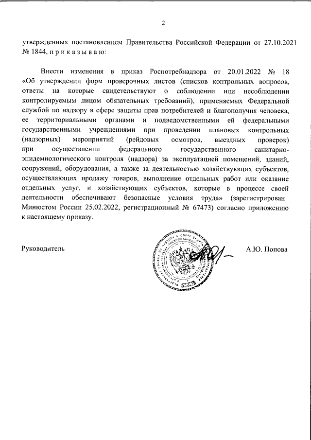 "О ВНЕСЕНИИ ИЗМЕНЕНИЙ В ПРИКАЗ РОСПОТРЕБРАДЗОРА ОТ 20.01.2022 N 18 "ОБ УТВЕРЖДЕНИИ ФОРМ ПРОВЕРОЧНЫХ ЛИСТОВ (СПИСКОВ КОНТРОЛЬНЫХ ВОПРОСОВ, ОТВЕТЫ НА КОТОРЫЕ СВИДЕТЕЛЬСТВУЮТ О СОБЛЮДЕНИИ ИЛИ НЕСОБЛЮДЕНИИ КОНТРОЛИРУЕМЫМ ЛИЦОМ ОБЯЗАТЕЛЬНЫХ ТРЕБОВАНИЙ), ПРИМЕНЯЕМЫХ ФЕДЕРАЛЬНОЙ СЛУЖБОЙ ПО НАДЗОРУ В СФЕРЕ ЗАЩИТЫ ПРАВ ПОТРЕБИТЕЛЕЙ И БЛАГОПОЛУЧИЯ ЧЕЛОВЕКА, ЕЕ ТЕРРИТОРИАЛЬНЫМИ ОРГАНАМИ И ПОДВЕДОМСТВЕННЫМИ ЕЙ ФЕДЕРАЛЬНЫМИ ГОСУДАРСТВЕННЫМИ УЧРЕЖДЕНИЯМИ ПРИ ПРОВЕДЕНИИ ПЛАНОВЫХ КОНТРОЛЬНЫХ (НАДЗОРНЫХ) МЕРОПРИЯТИЙ (РЕЙДОВЫХ ОСМОТРОВ, ВЫЕЗДНЫХ ПРОВЕРОК) ПРИ ОСУЩЕСТВЛЕНИИ ФЕДЕРАЛЬНОГО ГОСУДАРСТВЕННОГО САНИТАРНО - ЭПИДЕМИОЛОГИЧЕСКОГО КОНТРОЛЯ (НАДЗОРА) ЗА ЭКСПЛУАТАЦИЕЙ ПОМЕЩЕНИЙ, ЗДАНИЙ, СООРУЖЕНИЙ, ОБОРУДОВАНИЯ, А ТАКЖЕ ЗА ДЕЯТЕЛЬНОСТЬЮ ХОЗЯЙСТВУЮЩИХ СУБЪЕКТОВ, ОСУЩЕСТВЛЯЮЩИХ ПРОДАЖУ ТОВАРОВ, ВЫПОЛНЕНИЕ ОТДЕЛЬНЫХ РАБОТ ИЛИ ОКАЗАНИЕ ОТДЕЛЬНЫХ УСЛУГ, И ХОЗЯЙСТВУЮЩИХ СУБЪЕКТОВ, КОТОРЫЕ В ПРОЦЕССЕ СВОЕЙ ДЕЯТЕЛЬНОСТИ ОБЕСПЕЧИВАЮТ БЕЗОПАСНЫЕ УСЛОВИЯ ТРУДА"