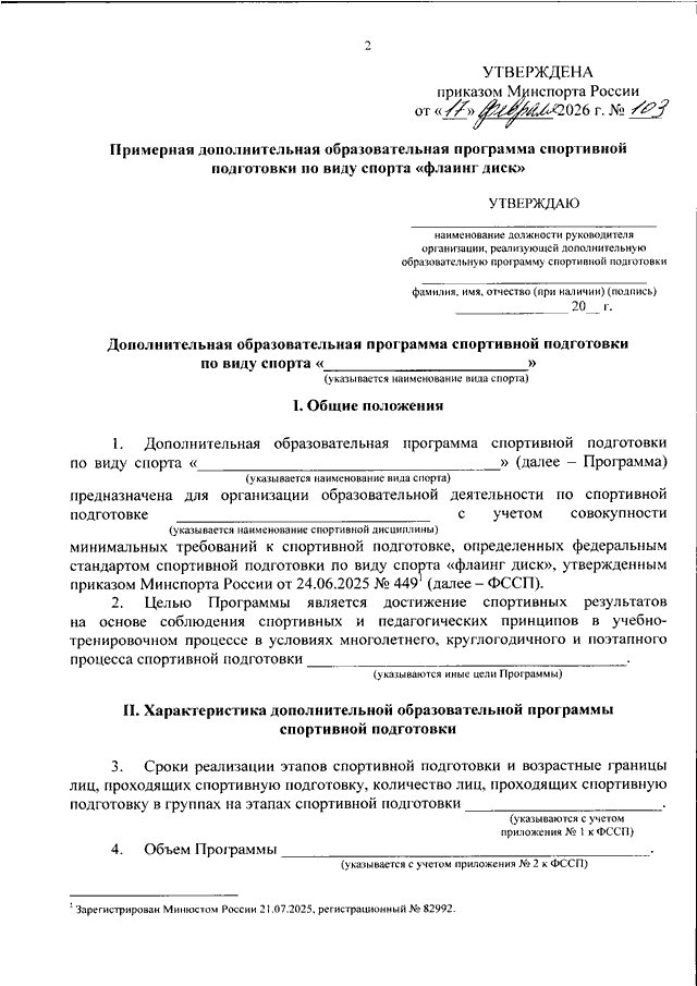 "ОБ УТВЕРЖДЕНИИ ПРИМЕРНОЙ ДОПОЛНИТЕЛЬНОЙ ОБРАЗОВАТЕЛЬНОЙ ПРОГРАММЫ СПОРТИВНОЙ ПОДГОТОВКИ ПО ВИДУ СПОРТА "ФЛАИНГ ДИСК"