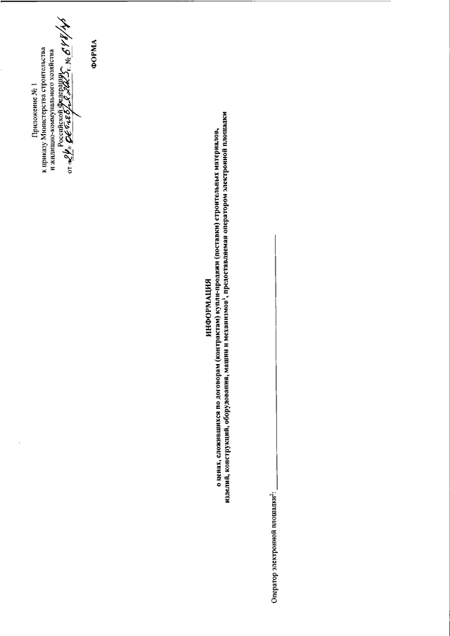 "ОБ УТВЕРЖДЕНИИ ФОРМ ПРЕДОСТАВЛЕНИЯ ОПЕРАТОРОМ ЭЛЕКТРОННОЙ ПЛОЩАДКИ, ОПЕРАТОРОМ ВНЕШНЕЙ ИНФОРМАЦИОННОЙ СИСТЕМЫ ИНФОРМАЦИИ О ЦЕНАХ, СЛОЖИВШИХСЯ ПО ДОГОВОРАМ (КОНТРАКТАМ) КУПЛИ - ПРОДАЖИ (ПОСТАВКИ) СТРОИТЕЛЬНЫХ МАТЕРИАЛОВ, ИЗДЕЛИЙ, КОНСТРУКЦИЙ, ОБОРУДОВАНИЯ, МАШИН И МЕХАНИЗМОВ"