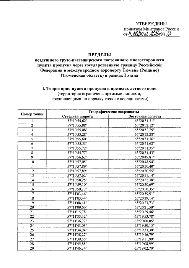 "ОБ ОТКРЫТИИ ВОЗДУШНОГО ГРУЗО - ПАССАЖИРСКОГО ПОСТОЯННОГО МНОГОСТОРОННЕГО ПУНКТА ПРОПУСКА ЧЕРЕЗ ГОСУДАРСТВЕННУЮ ГРАНИЦУ РОССИЙСКОЙ ФЕДЕРАЦИИ В МЕЖДУНАРОДНОМ АЭРОПОРТУ ТЮМЕНЬ (РОЩИНО) (ТЮМЕНСКАЯ ОБЛАСТЬ) В РАМКАХ 1 ЭТАПА И ОБ УТВЕРЖДЕНИИ ПРЕДЕЛОВ ДАННОГО ПУНКТА ПРОПУСКА ЧЕРЕЗ ГОСУДАРСТВЕННУЮ ГРАНИЦУ РОССИЙСКОЙ ФЕДЕРАЦИИ"