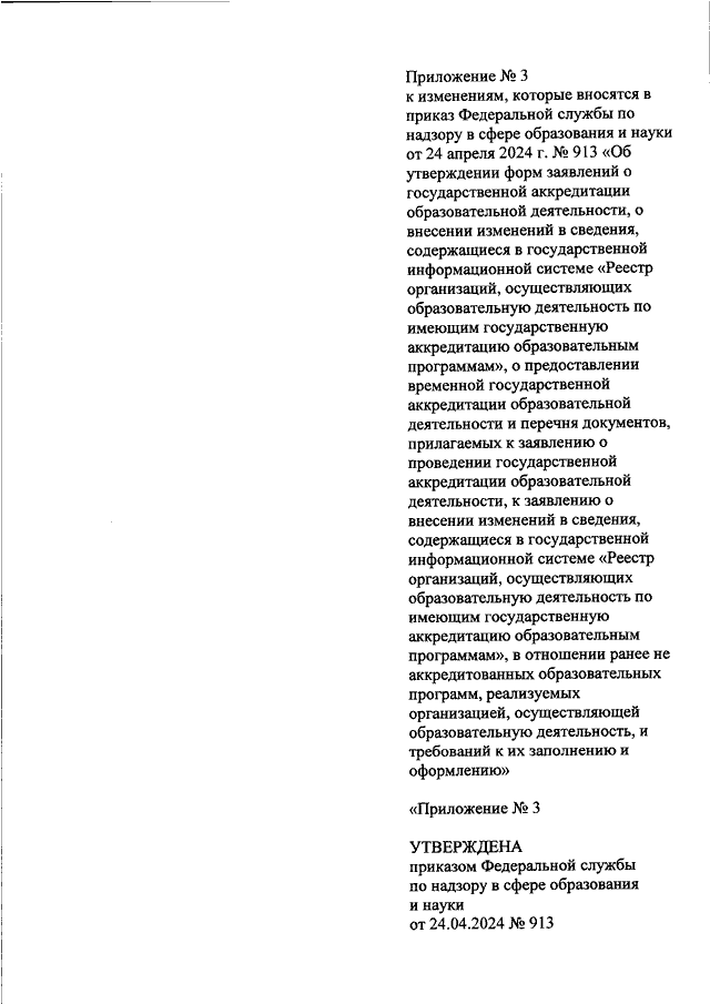 "О ВНЕСЕНИИ ИЗМЕНЕНИЙ В ПРИКАЗ ФЕДЕРАЛЬНОЙ СЛУЖБЫ ПО НАДЗОРУ В СФЕРЕ ОБРАЗОВАНИЯ И НАУКИ ОТ 24 АПРЕЛЯ 2024 Г. N 913"