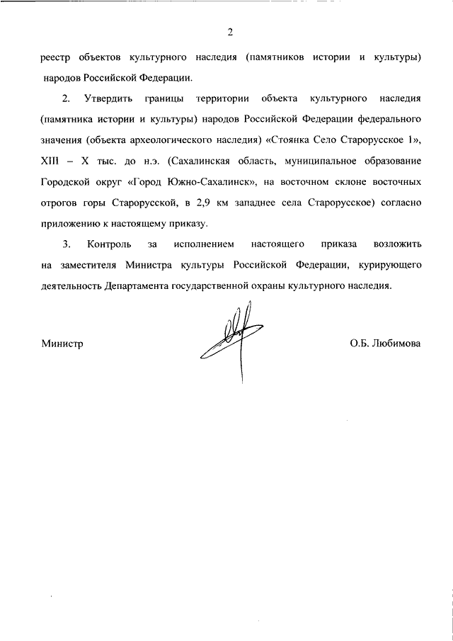 "О ВКЛЮЧЕНИИ ВЫЯВЛЕННОГО ОБЪЕКТА КУЛЬТУРНОГО НАСЛЕДИЯ (ПАМЯТНИКА ИСТОРИИ И КУЛЬТУРЫ) НАРОДОВ РОССИЙСКОЙ ФЕДЕРАЦИИ (ОБЪЕКТА АРХЕОЛОГИЧЕСКОГО НАСЛЕДИЯ) "СТОЯНКА СЕЛО СТАРОРУССКОЕ 1", XIII - X ТЫС. ДО Н.Э. (САХАЛИНСКАЯ ОБЛАСТЬ, МУНИЦИПАЛЬНОЕ ОБРАЗОВАНИЕ ГОРОДСКОЙ ОКРУГ "ГОРОД ЮЖНО-САХАЛИНСК", НА ВОСТОЧНОМ СКЛОНЕ ВОСТОЧНЫХ ОТРОГОВ ГОРЫ СТАРОРУССКОЙ, В 2,9 КМ ЗАПАДНЕЕ СЕЛА СТАРОРУССКОЕ) В ЕДИНЫЙ ГОСУДАРСТВЕННЫЙ РЕЕСТР ОБЪЕКТОВ КУЛЬТУРНОГО НАСЛЕДИЯ (ПАМЯТНИКОВ ИСТОРИИ И КУЛЬТУРЫ) НАРОДОВ РОССИЙСКОЙ ФЕДЕРАЦИИ В КАЧЕСТВЕ ОБЪЕКТА КУЛЬТУРНОГО НАСЛЕДИЯ (ПАМЯТНИКА ИСТОРИИ И КУЛЬТУРЫ) НАРОДОВ РОССИЙСКОЙ ФЕДЕРАЦИИ ФЕДЕРАЛЬНОГО ЗНАЧЕНИЯ И УТВЕРЖДЕНИИ ГРАНИЦ ЕГО ТЕРРИТОРИИ"