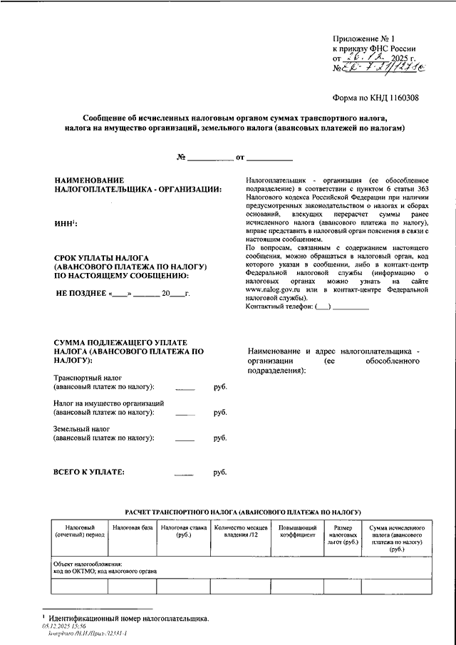 "ОБ УТВЕРЖДЕНИИ ФОРМЫ И ФОРМАТА СООБЩЕНИЯ ОБ ИСЧИСЛЕННЫХ НАЛОГОВЫМ ОРГАНОМ СУММАХ ТРАНСПОРТНОГО НАЛОГА, НАЛОГА НА ИМУЩЕСТВО ОРГАНИЗАЦИЙ, ЗЕМЕЛЬНОГО НАЛОГА (АВАНСОВЫХ ПЛАТЕЖЕЙ ПО НАЛОГАМ) В ЭЛЕКТРОННОЙ ФОРМЕ"