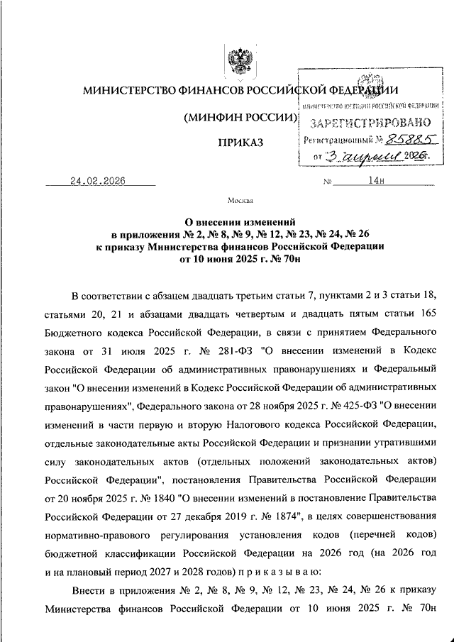 ПРИКАЗ Минфина РФ от 24.02.2026 N 14н