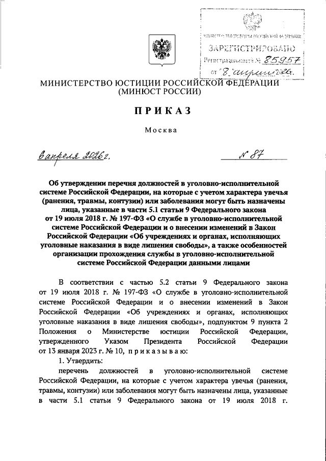 ПРИКАЗ Минюста РФ от 06.04.2026 N 87