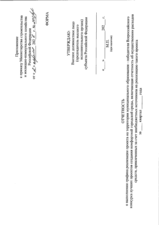 "ОБ УСТАНОВЛЕНИИ ФОРМЫ ОТЧЕТНОСТИ О ВЫПОЛНЕНИИ ГРАФИКА РЕАЛИЗАЦИИ ПРОЕКТА НА ТЕРРИТОРИИ МУНИЦИПАЛЬНОГО ОБРАЗОВАНИЯ - ПОБЕДИТЕЛЯ ВСЕРОССИЙСКОГО КОНКУРСА ЛУЧШИХ ПРОЕКТОВ СОЗДАНИЯ КОМФОРТНОЙ ГОРОДСКОЙ СРЕДЫ, ВКЛЮЧАЮЩЕЙ ОТЧЕТНОСТЬ ОБ ОСУЩЕСТВЛЕНИИ РАСХОДОВ СРЕДСТВ, ПРИВЛЕЧЕННЫХ ЗА СЧЕТ ВНЕБЮДЖЕТНЫХ ИСТОЧНИКОВ НА РЕАЛИЗАЦИЮ ТАКОГО ПРОЕКТА"