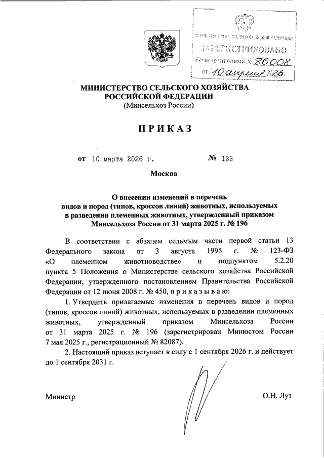 ПРИКАЗ Минсельхоза РФ от 10.03.2026 N 133