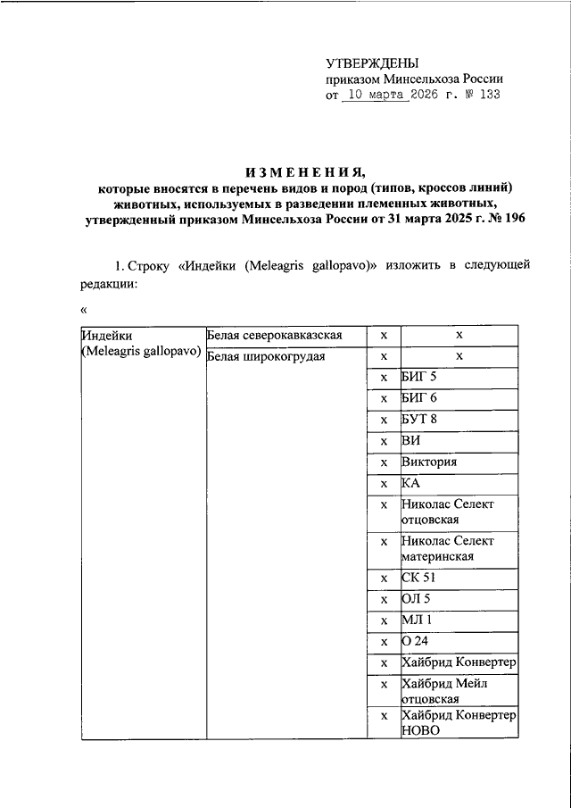"О ВНЕСЕНИИ ИЗМЕНЕНИЙ В ПЕРЕЧЕНЬ ВИДОВ И ПОРОД (ТИПОВ, КРОССОВ ЛИНИЙ) ЖИВОТНЫХ, ИСПОЛЬЗУЕМЫХ В РАЗВЕДЕНИИ ПЛЕМЕННЫХ ЖИВОТНЫХ, УТВЕРЖДЕННЫЙ ПРИКАЗОМ МИНСЕЛЬХОЗА РОССИИ ОТ 31 МАРТА 2025 Г. N 196"