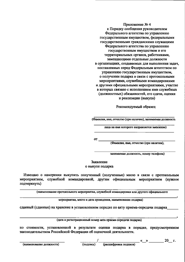 "ОБ УТВЕРЖДЕНИИ ПОРЯДКА СООБЩЕНИЯ РУКОВОДИТЕЛЕМ ФЕДЕРАЛЬНОГО АГЕНТСТВА ПО УПРАВЛЕНИЮ ГОСУДАРСТВЕННЫМ ИМУЩЕСТВОМ, ФЕДЕРАЛЬНЫМИ ГОСУДАРСТВЕННЫМИ ГРАЖДАНСКИМИ СЛУЖАЩИМИ ФЕДЕРАЛЬНОГО АГЕНТСТВА ПО УПРАВЛЕНИЮ ГОСУДАРСТВЕННЫМ ИМУЩЕСТВОМ И ЕГО ТЕРРИТОРИАЛЬНЫХ ОРГАНОВ, РАБОТНИКАМИ, ЗАМЕЩАЮЩИМИ ОТДЕЛЬНЫЕ ДОЛЖНОСТИ В ОРГАНИЗАЦИЯХ, СОЗДАВАЕМЫХ ДЛЯ ВЫПОЛНЕНИЯ ЗАДАЧ, ПОСТАВЛЕННЫХ ПЕРЕД ФЕДЕРАЛЬНЫМ АГЕНТСТВОМ ПО УПРАВЛЕНИЮ ГОСУДАРСТВЕННЫМ ИМУЩЕСТВОМ, О ПОЛУЧЕНИИ ПОДАРКА В СВЯЗИ С ПРОТОКОЛЬНЫМИ МЕРОПРИЯТИЯМИ, СЛУЖЕБНЫМИ КОМАНДИРОВКАМИ И ДРУГИМИ ОФИЦИАЛЬНЫМИ МЕРОПРИЯТИЯМИ, УЧАСТИЕ В КОТОРЫХ СВЯЗАНО С ИСПОЛНЕНИЕМ ИМИ СЛУЖЕБНЫХ (ДОЛЖНОСТНЫХ) ОБЯЗАННОСТЕЙ, ЕГО СДАЧИ, ОЦЕНКИ И РЕАЛИЗАЦИИ (ВЫКУПА)"