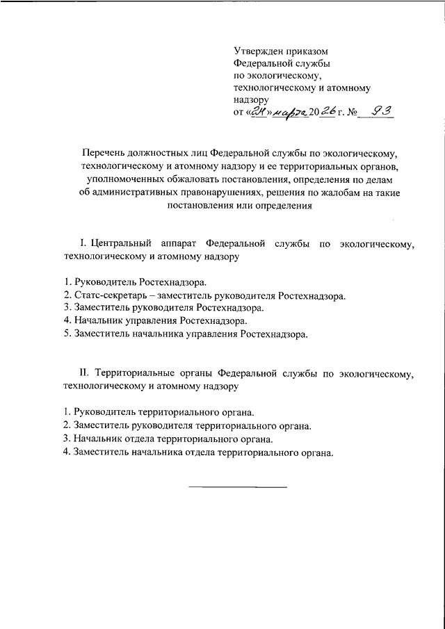 "ОБ УТВЕРЖДЕНИИ ПЕРЕЧНЯ ДОЛЖНОСТНЫХ ЛИЦ ФЕДЕРАЛЬНОЙ СЛУЖБЫ ПО ЭКОЛОГИЧЕСКОМУ, ТЕХНОЛОГИЧЕСКОМУ И АТОМНОМУ НАДЗОРУ И ЕЕ ТЕРРИТОРИАЛЬНЫХ ОРГАНОВ, УПОЛНОМОЧЕННЫХ ОБЖАЛОВАТЬ ПОСТАНОВЛЕНИЯ, ОПРЕДЕЛЕНИЯ ПО ДЕЛАМ ОБ АДМИНИСТРАТИВНЫХ ПРАВОНАРУШЕНИЯХ, РЕШЕНИЯ ПО ЖАЛОБАМ НА ТАКИЕ ПОСТАНОВЛЕНИЯ ИЛИ ОПРЕДЕЛЕНИЯ"